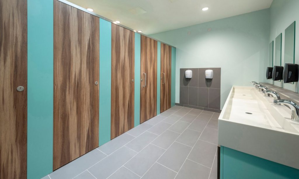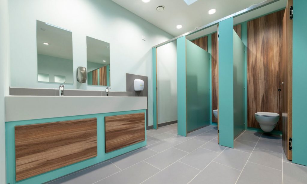 Another essential element to creating a natural feel throughout the washrooms was the colour palette. From our selection of high-quality laminates and robust solid surface, the client chose their nature inspired scheme.