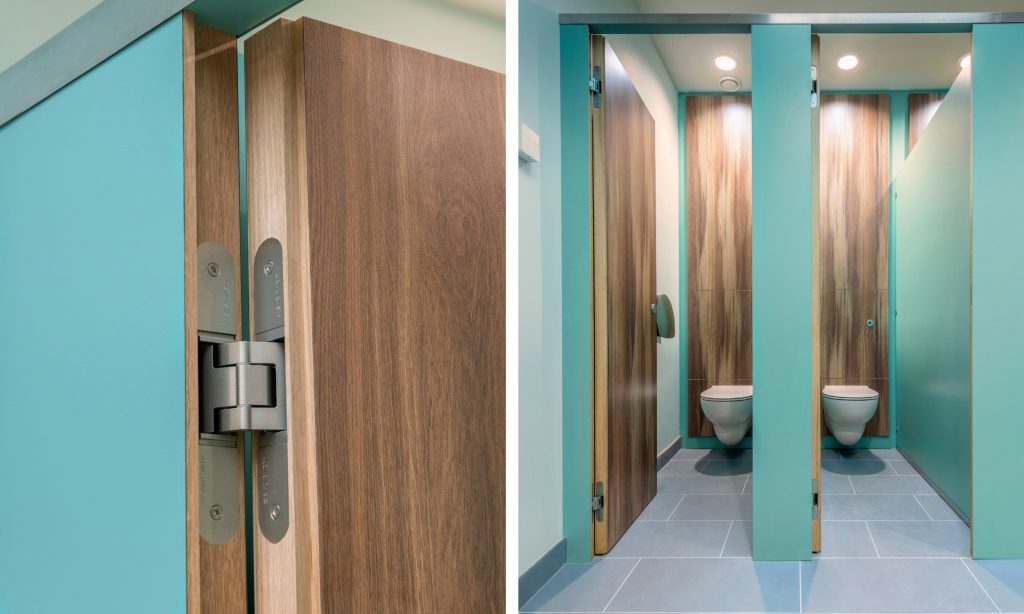 Finally, Oak was selected as the hardwood edge lipping on the cubicle and vanity panels, whereas the ironmongery had been completed with Satin Stainless Steel fixtures and fittings – pulling together the final look.
