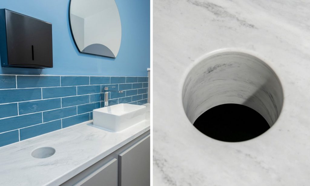 There are several distinguishing features and design details which defined the Mansfield Chambers installation. These include a Corian solid surface top with a seamless, thermoformed bin chute that’s built in to the vanity – in Carrara Lino.