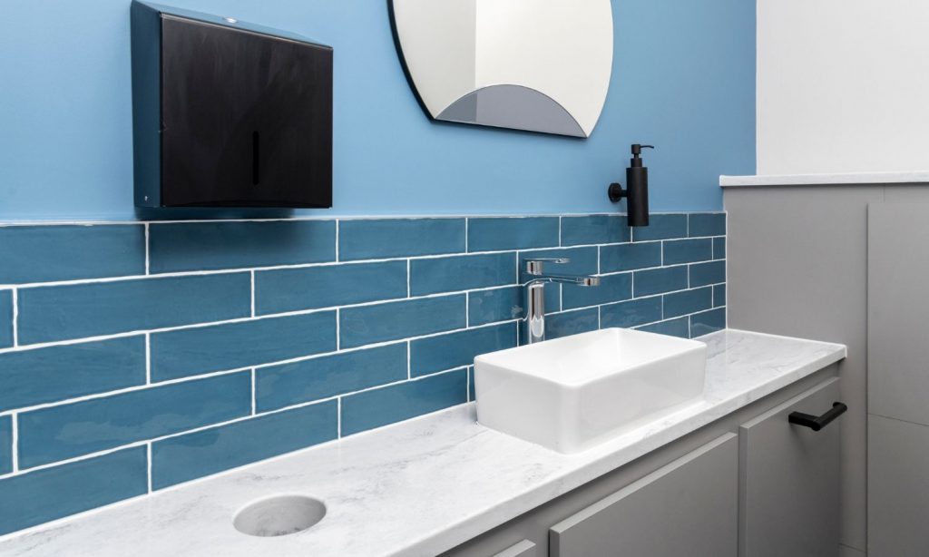 Workspace Design and the architect worked closely with us to select the colour scheme and product finishes, opting for a mix of whites, blues and greys. For example, the swirled, marble effect of the solid surface vanity and duct panel tops complement the, while the laminate duct panels and vanity under panels, both in Formica Tornado (F1535). Finally, the washrooms are completed with Satin Stainless Steel fixtures and fittings to complement the cool toned palette.