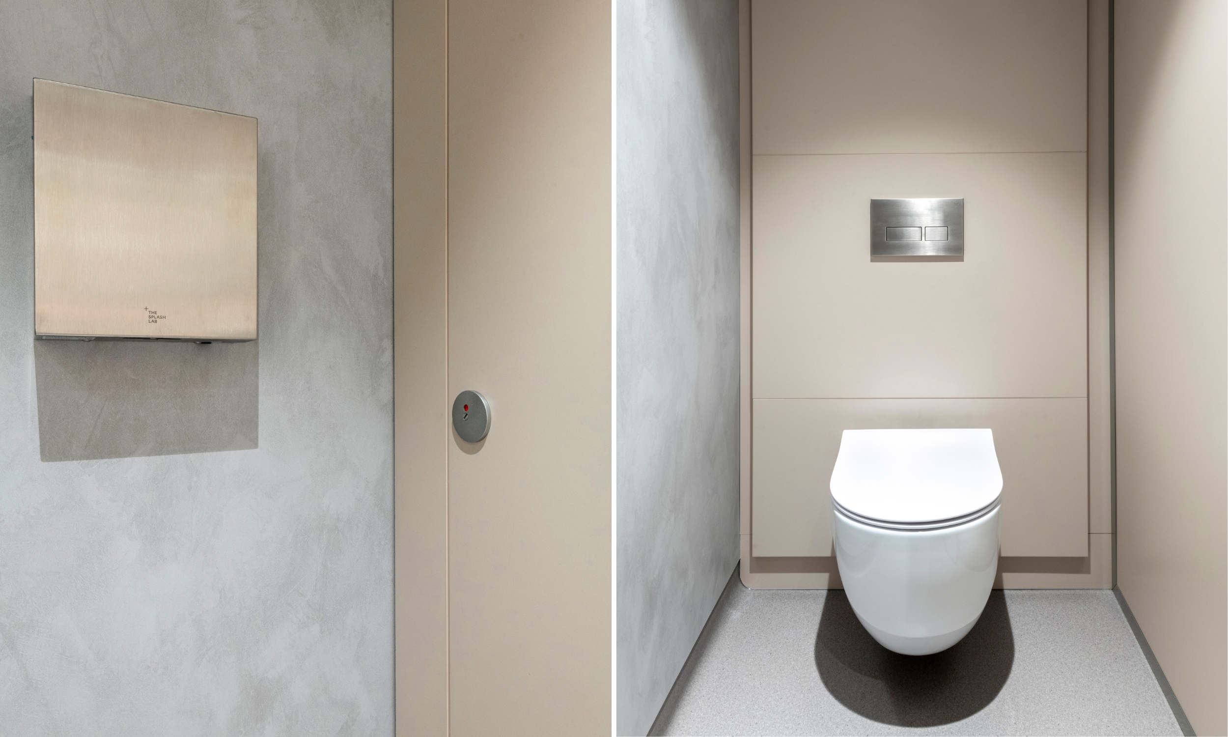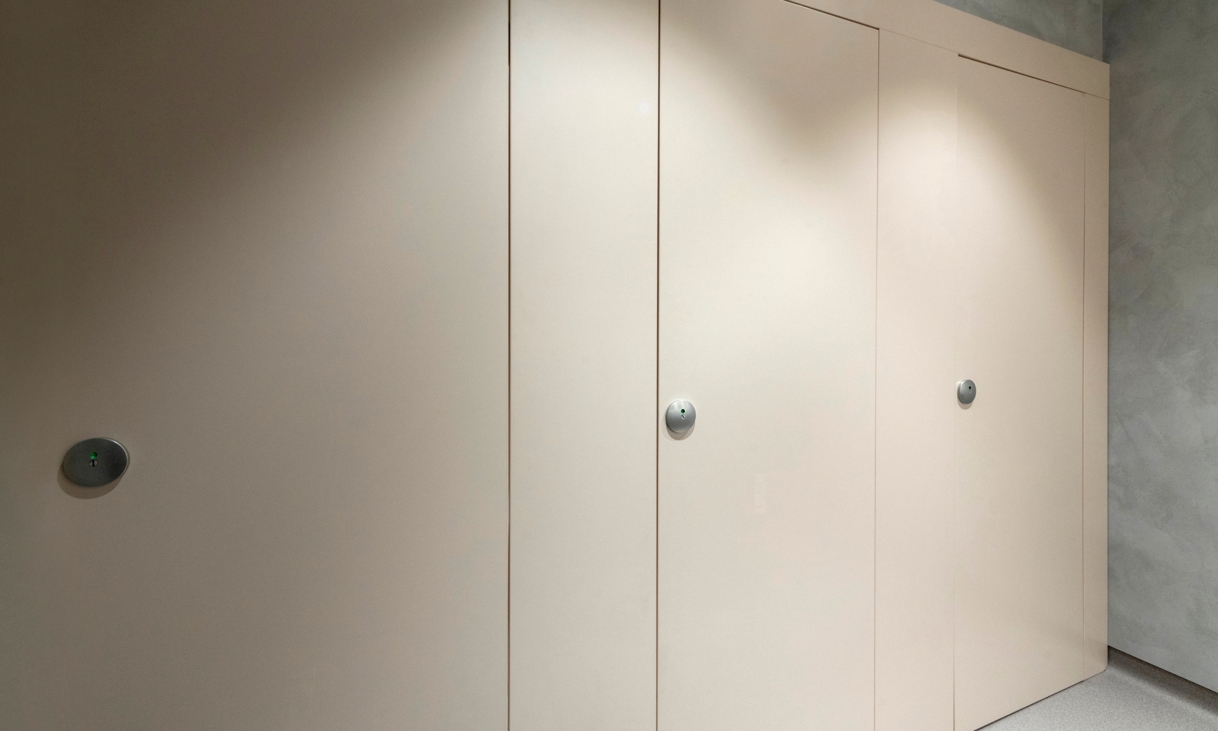 Material Source’s male washroom features a light, neutral palette designed to instil a sense of openness and brightness throughout the space. Selecting our Identity cubicle range, its flush, streamlined cubicle doors and pilasters in Beige Nature (B119) created a seamless solution that complemented against the mottled stone look of Altro’s Urban Mineral wall covering.
