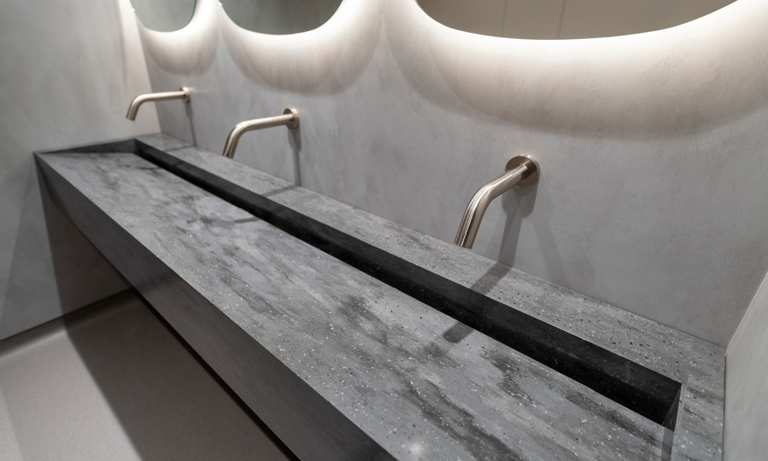 A multi Solid Surface wash trough in Carbon Aggregate was installed, featuring a subtle slope and a partial gap for concealed waste, and was cantilevered to achieve a striking floating appearance. Collaborating with other partners at Material Source, the light washroom scheme exudes a welcoming atmosphere, inviting visitors to experience tranquility amidst the studio’s bustling environment.